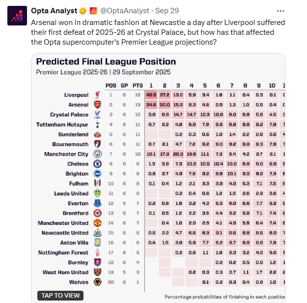 Menurut data simulasi daripada superkomputer Opta, yang menjalankan ribuan analisis dan ramalan berdasarkan prestasi, penguasaan bola, jaringan dan jadual perlawanan, Arsenal kini mempunyai peluang 41.6% untuk menjuarai Liga Perdana 2025/26.